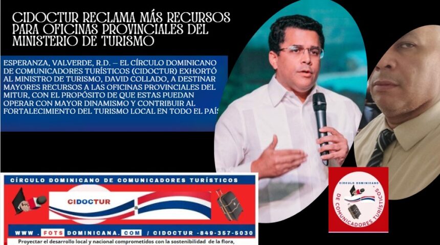 Esperanza, Valverde, R.D. — El Círculo Dominicano de Comunicadores Turísticos (CIDOCTUR) exhortó al ministro de Turismo, David Collado, a destinar mayores recursos a las oficinas provinciales del MITUR, con el propósito de que estas puedan operar con mayor dinamismo y contribuir al fortalecimiento del turismo local en todo el país.