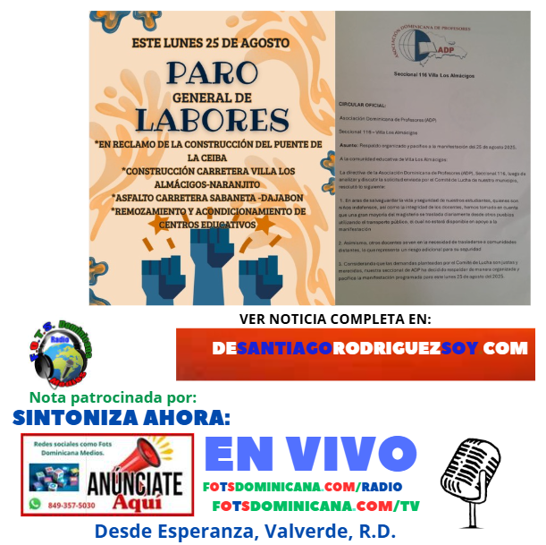 Villa Los Almácigos, Santiago Rodríguez, R.D..- Para este lunes 25 de agosto de 2025 ha sido pautado un paro general de labores en demanda de la construcción del puente de La Ceiba, la carretera Villa Los Almácigos–Naranjito, el asfaltado de la vía Sabaneta–Dajabón y el remozamiento de los centros educativos de la zona.